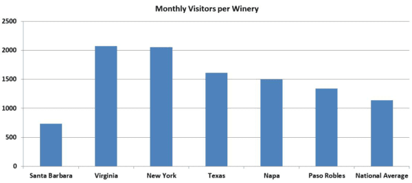 Santa Barbara, like other wine regions, relies on winery direct sales more than ever. But at the same time, Santa Barbara has faced immense community pushback that is clearly reflected in the statistics. Santa Barbara produces quality wines on par with Napa, Sonoma and Paso Robles, but the average bottle price of a Santa Barbara wine is $30-$39, compared to the national average of $43. And despite the quality of wines, Santa Barbara ranks near the bottom of average monthly visitors per winery, with only 731 average monthly visitors, compared to the national average of 1,136.
