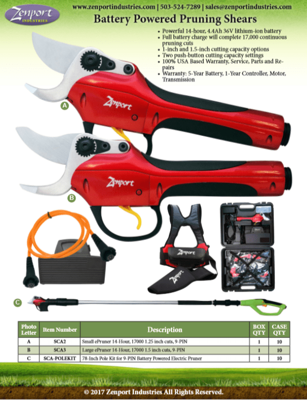 Zenport will be displaying our full line of professional vineyard industry tools for pruning and maintaining properly cared for grape vines. Please stop by our booth to view our portable electric pruning systems for vineyards, orchards and other specialty horticulture tools. Zenport offers full warranty coverage, service and parts on all of our electric pruning tools.
