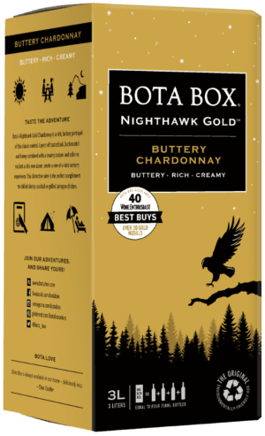 Bota Box Nighthawk Gold Buttery Chardonnay joins the Nighthawk Tier with Nighthawk Black Red Blend and Nighthawk Black Cabernet, along with the complete Bota Box portfolio of wines. Bota Box Nighthawk Tier labels are available in 3-liter options while the remainder of the line is available in 3-liter and 1.5-liter bag-in-boxes and in convenient 500-milliliter Tetra Pak single servings.