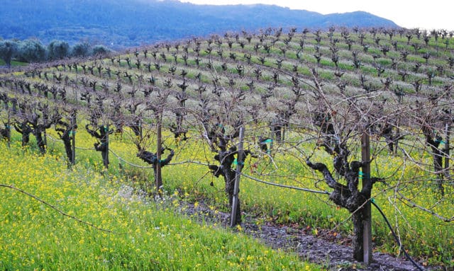 The Sonoma County landscape of gnarly vines and yellow mustard grass is part of the experience of winter in wine country. Photo: Wine Institute.