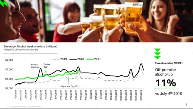 The high end of spirits continues to drive growth, with the ultra premium price tier up 12% compared to last year and +94% compared to 2019. Remember that during the pandemic, premiumization in alcohol experienced accelerated growth rates in off-premise channels. While premiumization most definitely continues in spirits, it is slowing compared to the accelerated rates from last year. For the July 4th holiday 2020, the high end of spirits (super premium and ultra price tiers) gained 4.3 share points compared to 2019. For 2021, the high end continues to gain share, but at a slower rate, now up 1.8 share points compared to last year.