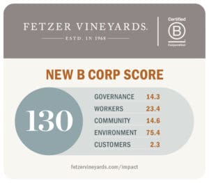 HOPLAND, Calif., October 21, 2021 — Fetzer Vineyards, the largest winery certified as a B Corporation in the United States and a leader in regenerative winegrowing, today announced a milestone in the company’s longtime dedication to responsible business practices: a new B Corp score of 130. This new score, which reflects a remarkable 37% increase from the company’s previous score, puts Fetzer Vineyards in the “Outstanding” category for B Corps globally, an elite group of purpose-focused businesses verifiably recognized for using business as a force for good.
