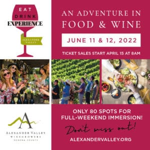 HEALDSBURG, Calif. (April 6, 2022) – Alexander Valley Winegrowers presents Eat Drink Experience Alexander Valley, a two-day festival of intimate, exclusive experiences hosted by participating Alexander Valley wineries and focused on showcasing the region’s world-class wines, geographic diversity, and winegrowing traditions. Tickets are available beginning April 15 for full-weekend experiences (only 80 tickets are available at this level) and can be purchased on the Alexander Valley Winegrowers website.