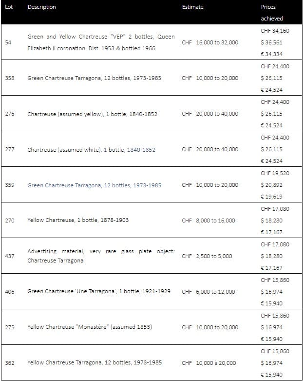 The top lot in the auction, lot #54, comprising two bottles of green and yellow Chartreuse “VEP” – distilled in 1953, and bottled in 1966 – marking the coronation of Queen Elizabeth II and complete with its original wooden case was sold for CHF 34,160, easily exceeding its high estimate. These were closely followed in the top ten by a stunning set of 12 bottles of Green Chartreuse de Tarragona 1973-1985, lot #358, which sold for CHF 24,400. The top ten totaled nearly CHF 210,000.