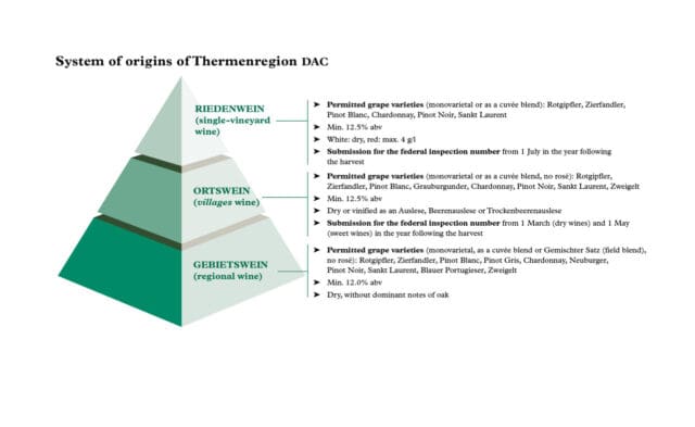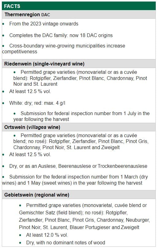 The first DAC wines from this wine-growing region south of Vienna in Niederösterreich (Lower Austria) will be produced from the 2023 harvest. Riedenwein (single-vineyard wine) represents the pinnacle of the three-tier origin pyramid for the Thermenregion DAC and includes the flagship varieties of Zierfandler, Rotgipfler, St. Laurent and Pinot Noir, alongside Pinot Blanc and Chardonnay. The Ortswein (villages wine) occupies the centre DAC tier and includes the above varieties, as well as Pinot Gris and Zweigelt (Rotburger). The DAC villages of the Thermenregion are Perchtoldsdorf, Gumpoldskirchen, Tattendorf, Wiener Neustadt and Bad Vöslau. The regional wines, with no mention of the municipality or Ried on the label, are sold as Gebietswein Thermenregion DAC and include all the above varieties, together with Neuburger, Gemischter Satz (field blend) and Blauer Portugieser, resulting in a traditionally wide diversity of wines.