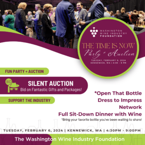 November 3rd – Prepare for an evening of fine wine, camaraderie, and philanthropy as the Washington Wine Industry Foundation presents the 2024 Party + Auction. Over 400 wine industry enthusiasts and friends unite on Tuesday, February 6, 2024, at the Toyota Center in Kennewick. This event promises an unforgettable experience, showcasing the best of Washington wine while contributing to the future of this flourishing industry.