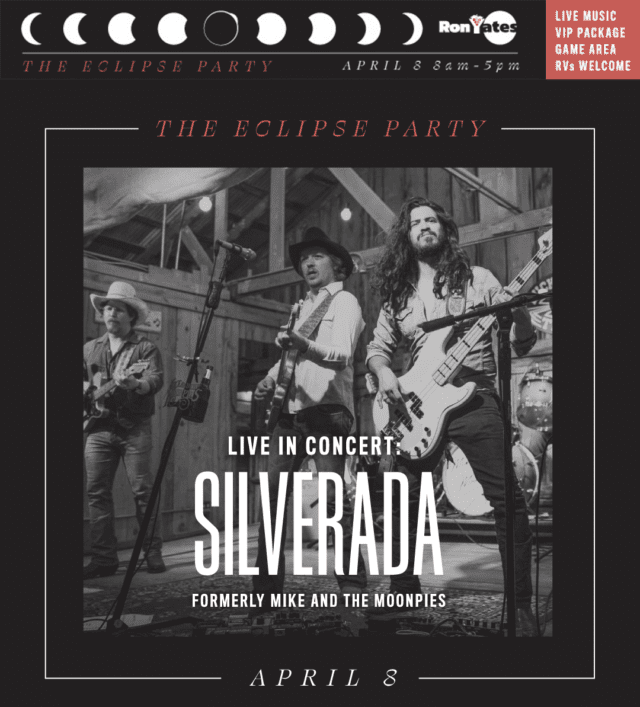The opening band is Soul Wagon, which specializes in classic 50’s and 60’s era jazz. A perfect vibe for kickin’ back outside with a glass of wine. Headliners, Mike and the Moonpies, who just changed their name to Silverada, are layered with Telecaster twang and honky-tonk harmonies, making the perfect soundtrack for a total eclipse.
