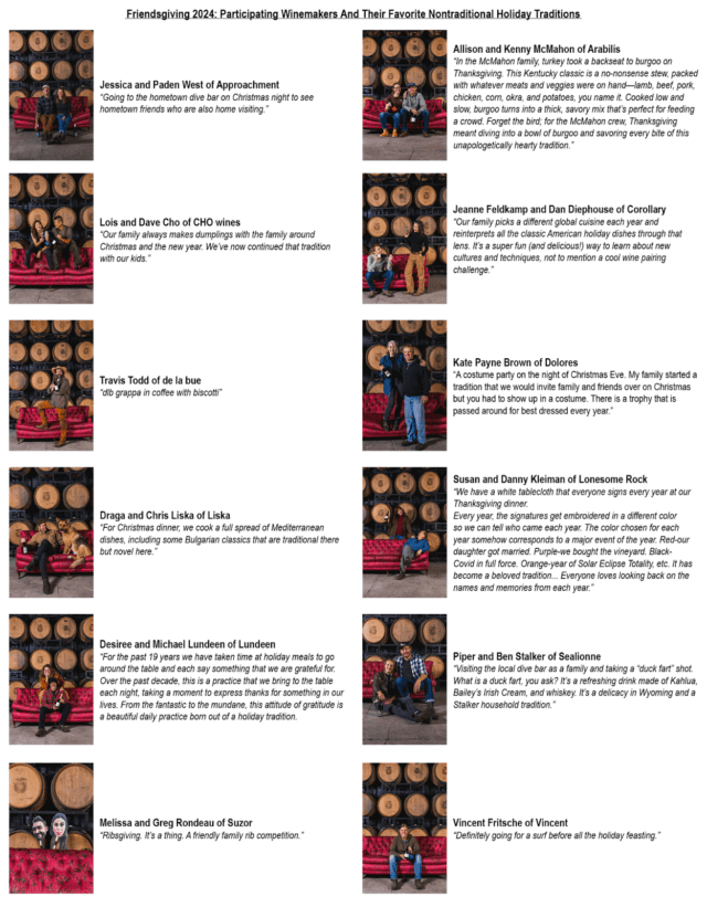 Each participating winery will pour two carefully selected wines at the event. Chef Brett Uniss of Humble Spirit will craft a menu of bites inspired by the winemakers’ own favorite holiday pairings and food memories, creating a festive and nostalgic atmosphere.