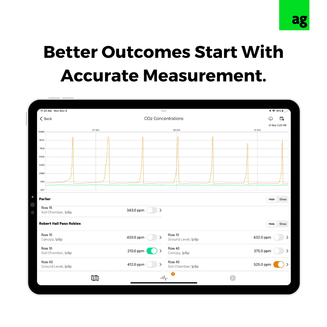 Agrology’s system measures the total CO₂ respiration—a direct indicator of microbial activity in the soil. Researchers have relied on this metric for over 50 years to assess soil health, as CO₂ levels reflect the ‘breathing’ of soil microbes as they digest organic matter and cycle nutrients. High respiration rates indicate healthy, active soils teeming with beneficial microorganisms, which are vital for supporting vine health and productivity.
