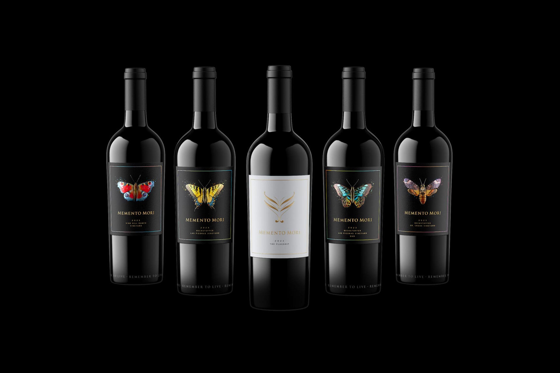 “The intention was to design each Memento Mori bottle to feel unique but also complement each other handsomely as a family,” says Craun, a classically trained artist who also designed the Memento Mori’s iconic gold logo – two M’s that intersect to create a butterfly shape – which will remain front and center on each bottle of the label’s Flagship Cabernet Sauvignon.