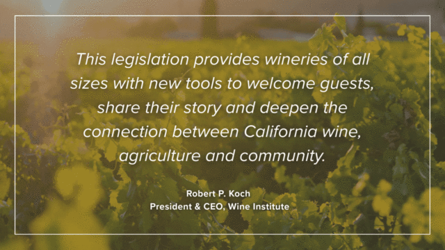“At a time when our industry faces tightening sales and increasing competition, AB 720 ensures that California wineries can continue to thrive by offering visitors authentic, memorable experiences,” said Robert P. Koch, president and CEO of Wine Institute. “This legislation provides wineries of all sizes with new tools to welcome guests, share their story and deepen the connection between California wine, agriculture and community.”