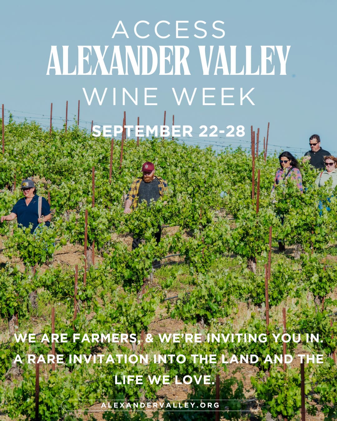 September 16, 2025 (Alexander Valley, CA) – For the first time ever, the families, growers, and winemakers of Alexander Valley are opening their doors for Access Alexander Valley Wine Week, a one-week celebration running September 22–28, 2025. Guests are invited to step into the vineyards, cellars, and properties of Sonoma County’s premier winegrowing region for exclusive excursions and intimate wine activations — many of which are only available during Wine Week.