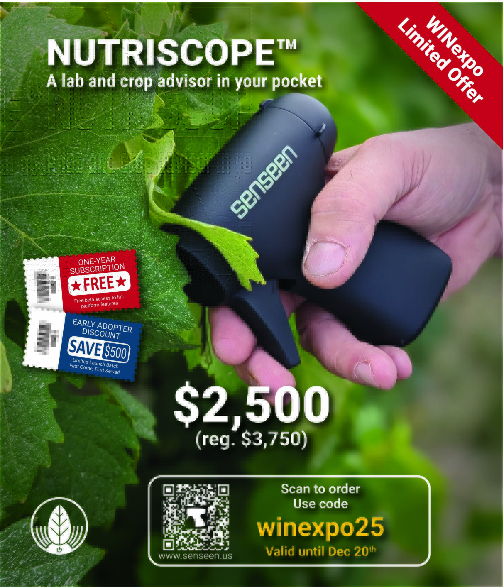 Senseen was founded in France and launched its U.S. operations in California, where Nutriscope is now calibrated for regional crops and used by advisors, vineyard managers, and agronomists.