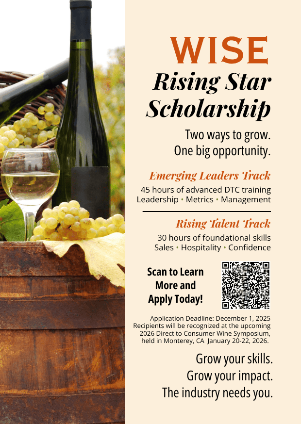Now in its 16th year supporting winery DTC, WISE continues its commitment to helping winery professionals grow through hands-on education, coaching, and certification. The new scholarships support both emerging professionals and rising managers who demonstrate heart, hustle, and a commitment to excellence. Recipients will be recognized at the 2026 Direct to Consumer Wine Symposium, held in Monterey California January 20-22, 2026.