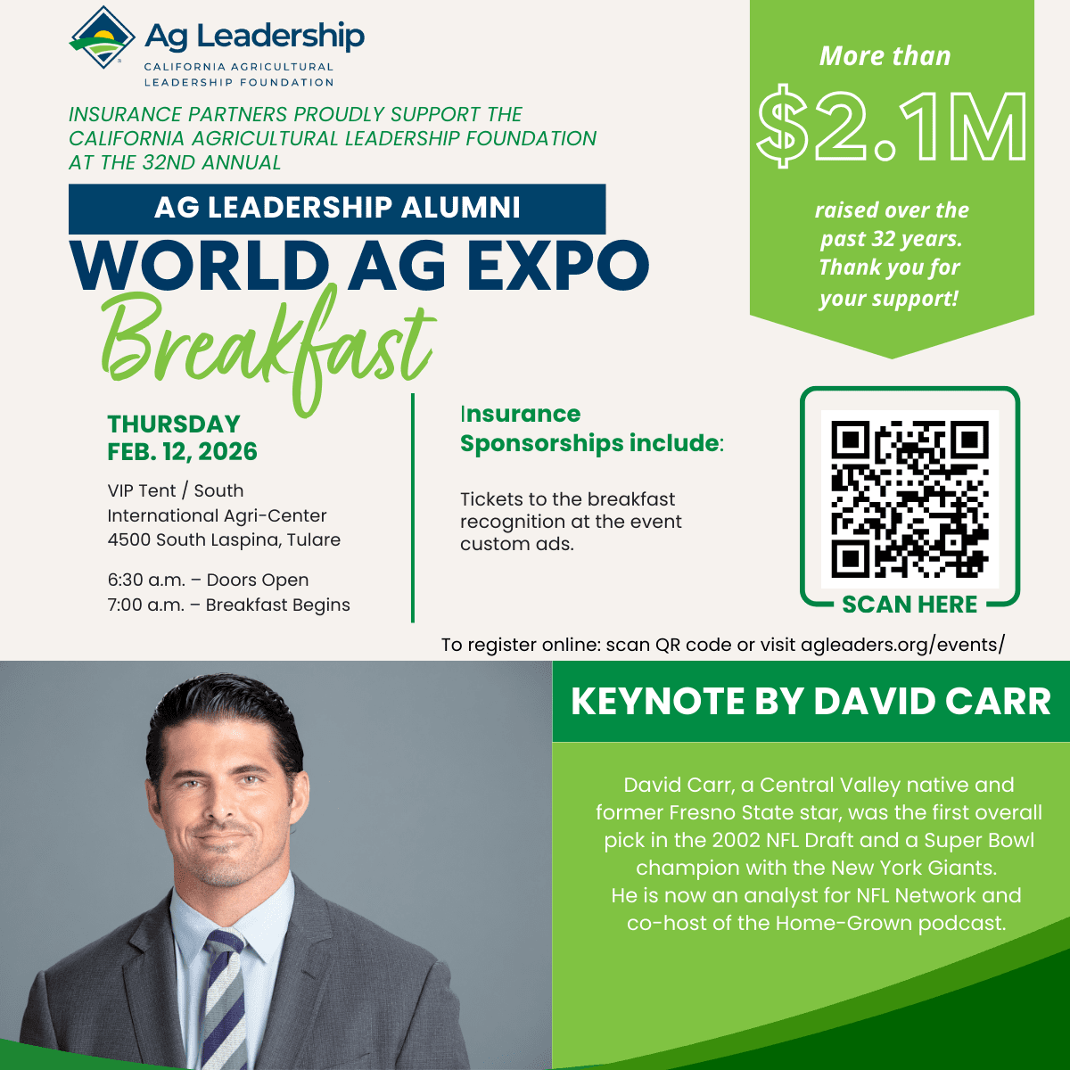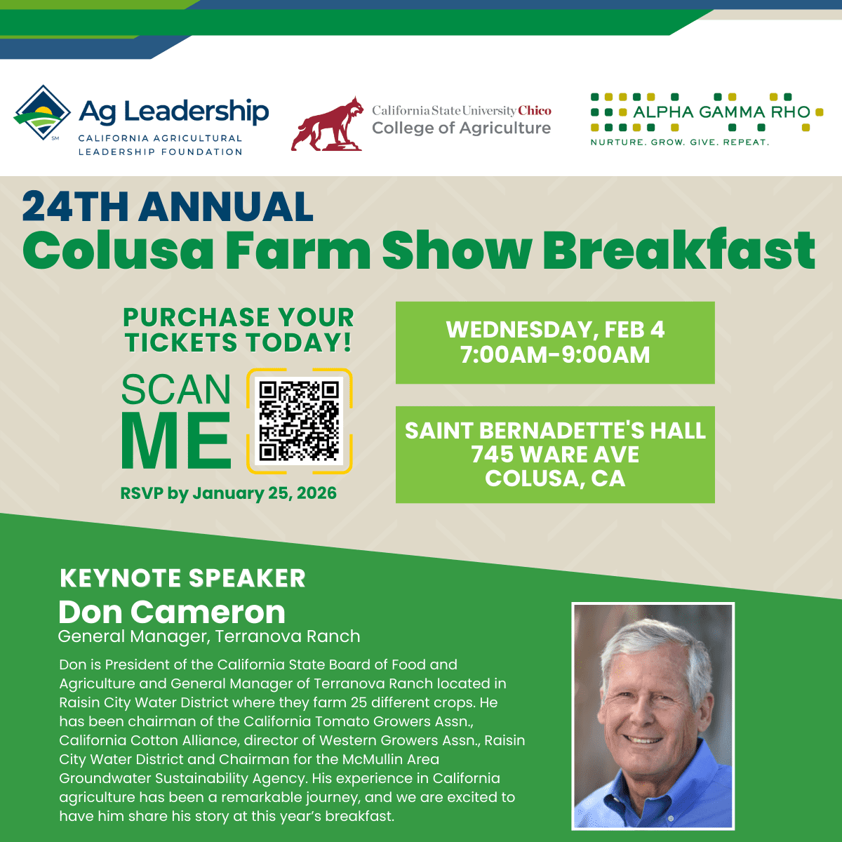 The 2026 breakfast will take place at 6:30 a.m. on Wednesday, Feb. 12 in the VIP Tent South, International Agri-Center, Tulare, CA.