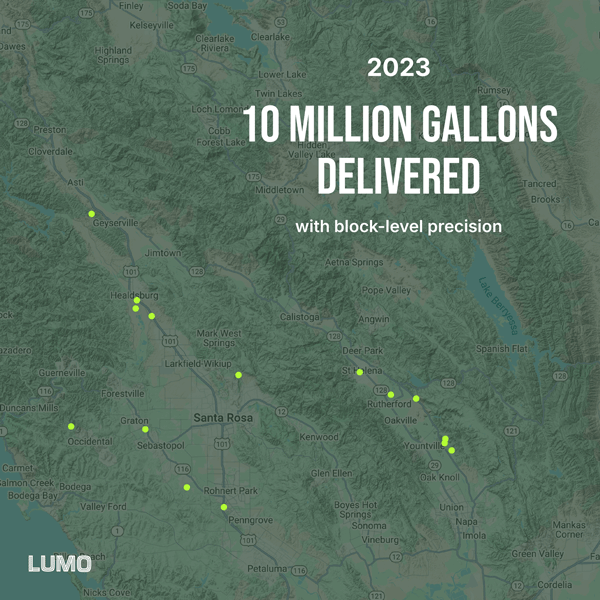 In 2025, Lumo delivered over 650 million gallons of water with block-level precision across 150+ vineyards, including Treasury, JFW, Trinchero, Delicato, Antinori, Chateau Montelena and Clos du Val.