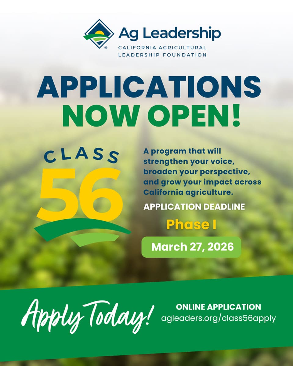 “For more than 56 years, the Ag Leadership Program has focused on developing leaders who are prepared to make a meaningful impact across California agriculture and their communities,” said Lesa Eidman (Class 49), president and CEO of the California Agricultural Leadership Foundation. “We are seeking individuals who are curious, committed, and ready to invest in their own growth while helping shape the future of our industry.”
