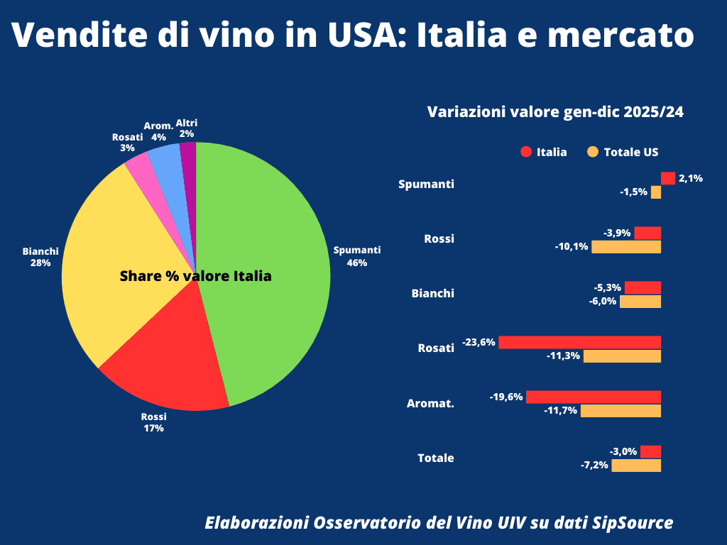 Italy also closed 2025 with negative results, but performed better than the market average, recording a decline of 5.2% in volume and 3% in value, compared to an overall market that was strongly affected by the crisis of U.S. domestic wines, which posted volume losses close to 10%.