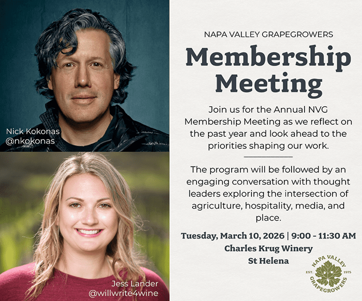 February 24, 2026 (Napa Valley, CA) — The Napa Valley Grapegrowers (NVG) Annual Membership Meeting will take place on Tuesday, March 10, 2026 at Charles Krug Winery in St. Helena, Napa Valley. NVG will reflect on the year behind and look ahead to the priorities guiding its work in the months ahead. NVG’s Executive Director, Caleb Mosley, will share an update on current initiatives, strategic focus areas, and how the organization continues to support Napa Valley grape growers through education, advocacy, and stewardship.