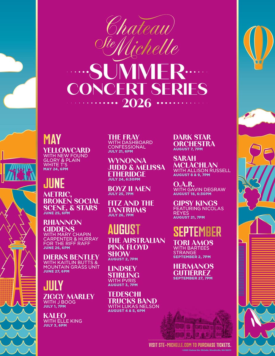 March 16, 2026 (Woodinville, WA) — Chateau Ste. Michelle is proud to announce the lineup for its highly anticipated 2026 Summer Concert Series, marking 42 years of live music at the iconic Woodinville winery. The season will feature 21 performances and kick off May 24 with Yellowcard, continuing a cherished Pacific Northwest summer tradition.
