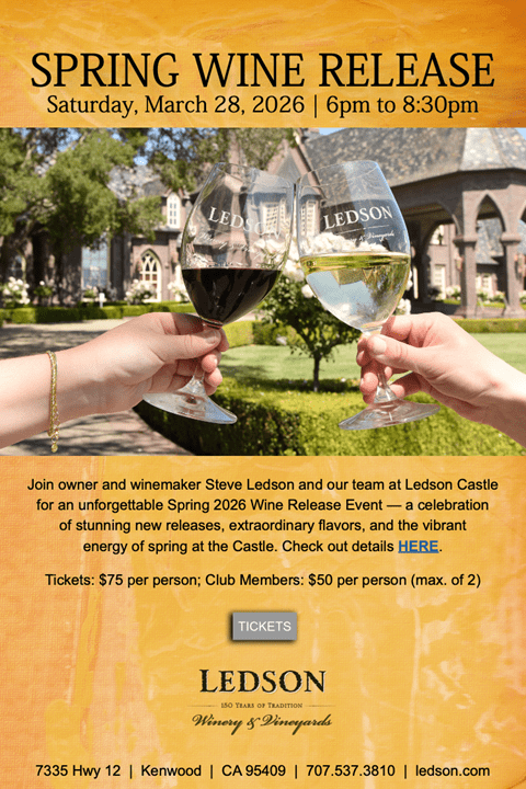 March 16, 2026 (Kenwood, CA) — Please join owner and winemaker Steve Ledson and the team at the Ledson Castle for an unforgettable Spring 2026 Wine Release Event — a celebration of stunning new releases, extraordinary flavors, and the vibrant energy of spring at the Castle. On Saturday, March 28 from 6-8:30pm, Ledson Winery & Vineyards will feature tastings of several exciting new wines along with an Oyster Bar, Gourmet Pizza Oven, a selection of Artisanal Cheeses and Live Music.