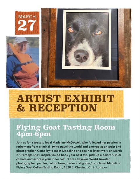 LOMPOC, CA (March 17, 2026) – Flying Goat Cellars is hosting a reception on for Lompoc artist Madeline McDowell on March 27 from 4-6pm at the Tasting Room. McDowell followed her passion in retirement from criminal law to travel the world and emerge as an artist and photographer. All are invited to come by to meet McDowell and see her watercolors and photos. Perhaps she’ll inspire you to book your next trip, pick up a paintbrush or camera and express your inner self. “I am a kayaker, World Traveler, photographer, painter, nature lover, birder and golfer,” proclaims Madeline. Her work will be on display through May 4.