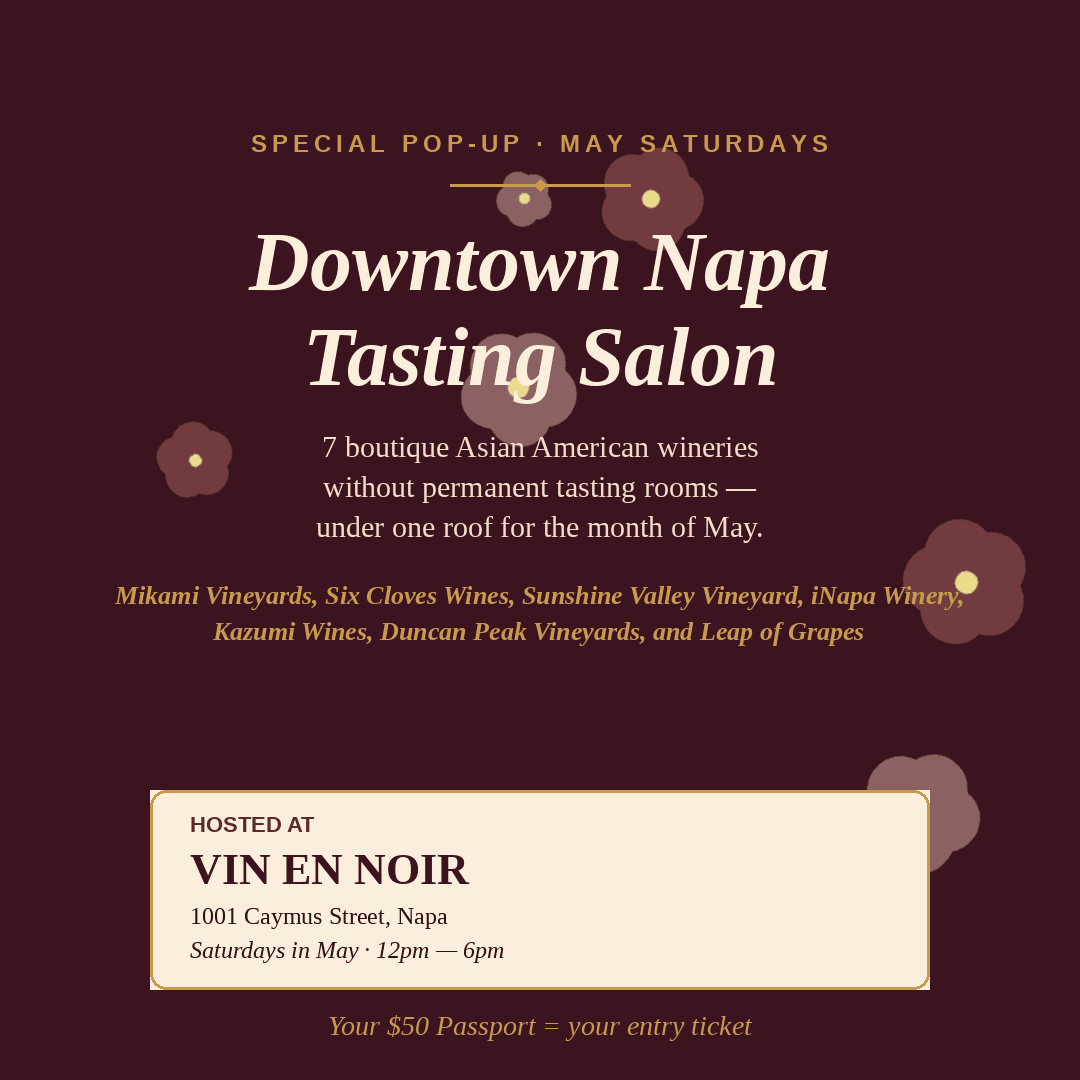 Participating tasting rooms include: Iron Horse Vineyards, Sunset Cellars, RD Wines, Sakura Winery, Marchelle Wines, Ektimo Wines, Noria Wines, and LangeTwins and Akiyoshi Wines. The Downtown Napa Tasting Salon at Vin En Noir (Saturdays, 12–6 pm) will feature boutique winery pop-ups from Mikami Vineyards, Six Cloves Wines, Sunshine Valley Vineyard, iNapa Winery, Kazumi Wines, Duncan Peak Vineyards, and Leap of Grapes. The tasting experiences included are valued at $250+, offering exceptional value while connecting guests directly with the people and stories behind the wines.