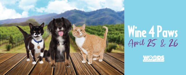 Whether you’re close by or celebrating from afar, you can make a difference. Support any participating Wine 4 Paws business April 25–26 when 10% of your purchase will be donated to Woods to help animals in need.