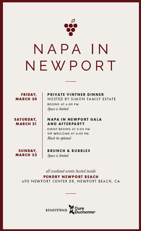 For the first time, Napa in Newport expands into a full weekend celebration, bringing the finest of Napa Valley to Newport Beach. Highlighted by Vintner Chair Peter Michael Winery, the experience features rare pours from acclaimed Napa vintners and supports CureDuchenne’s mission to cure Duchenne muscular dystrophy. The weekend begins Friday with intimate vintner-hosted dinners, followed by Saturday’s Gala showcasing more than 25 prestigious wineries and a culinary experience led by Chef Colin Bedford of the Beverly Wilshire, A Four Seasons Hotel. The evening continues with a VIP After Party at the Elwood Club, concluding Sunday with an elegant brunch.